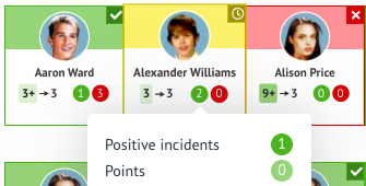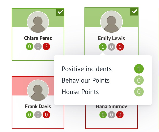 Positive incidents and positive behaviour award points are added up in the green circle; negative incidents and behaviour award points are added up in the red circle; and neutral incidents are tallied in the grey circle.