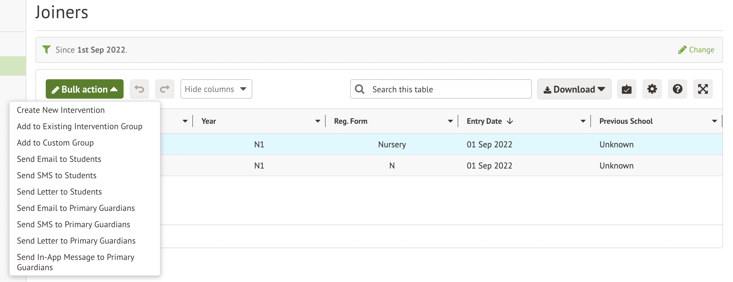 On this page, you can see students that have joined your school since the beginning of the current academic year. You'll see where students came from (their previous school if known) and their year group and registration form if they have been assigned one.