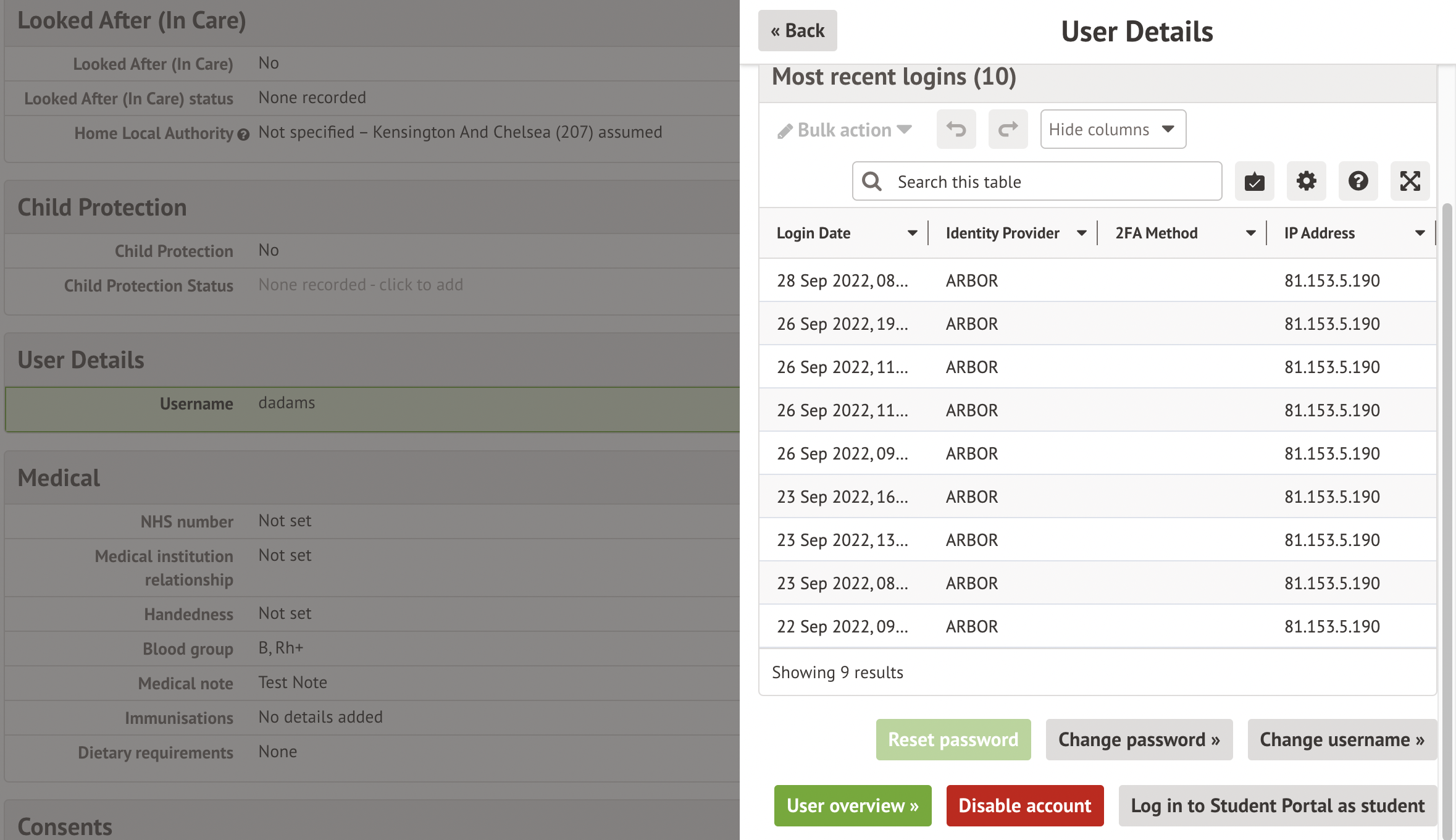 If you do not want a student to be able to access the Student Portal, you can disable their account from the User Details section of their student profile.