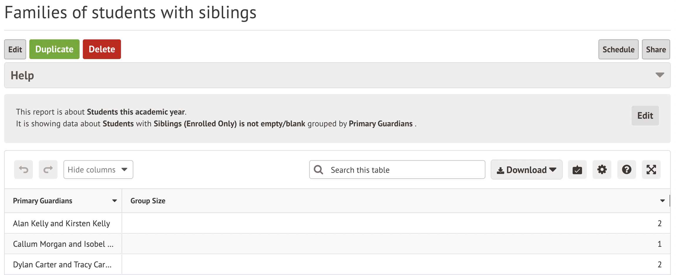 - For a report of guardians linked to at least one student, plus a count of the number of families, use the Families of students with siblings report.