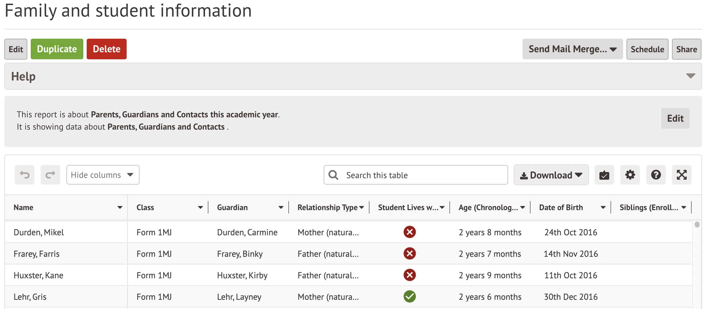 - For a report on students and their primary guardians (plus student ages so you can sort columns to find the oldest siblings), use our Family and student information report.