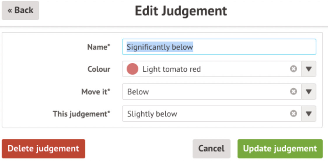 In the target judgements page you can click into each judgement to see what colour it uses. In my example significantly below is light tomato red, hence the 4 in the marksheet being red.