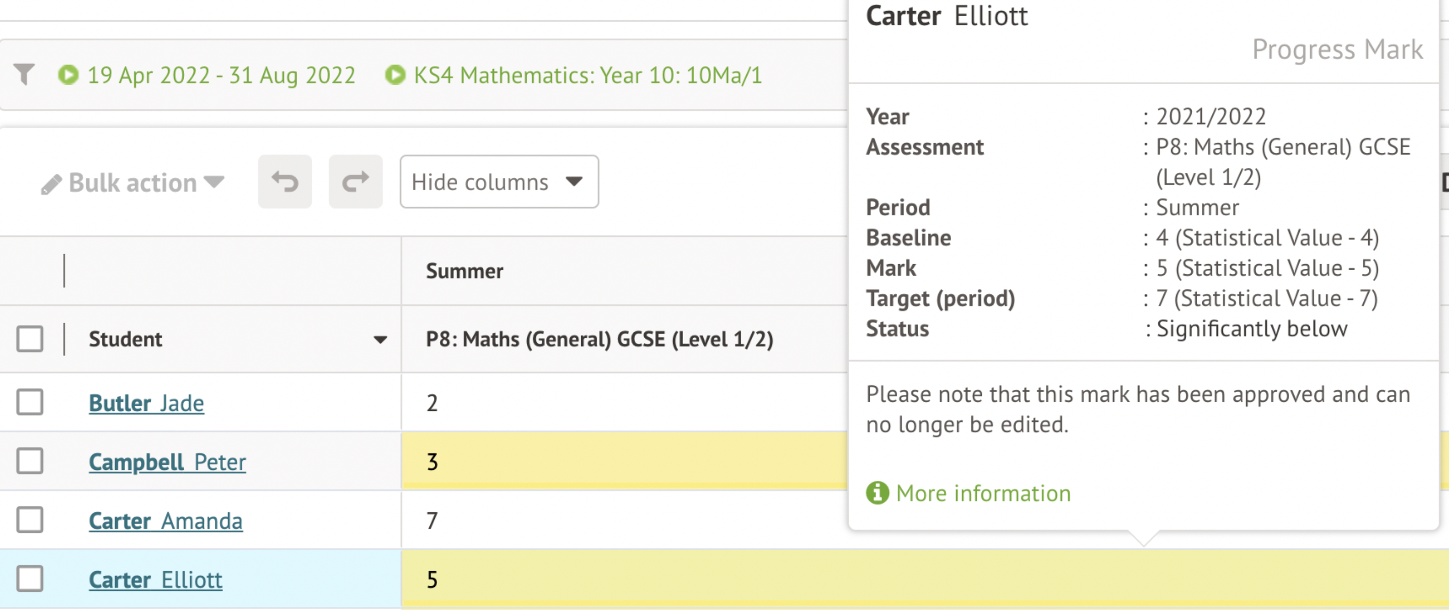 In the pop-up, you can see what the mark is (4) and what the target for the period is (6). You can also see the Status of this grade. This tells you which of the judgements applies to that grade. For this grade, the status is Significantly Below. To know why this is the case, we have to check a few more things.