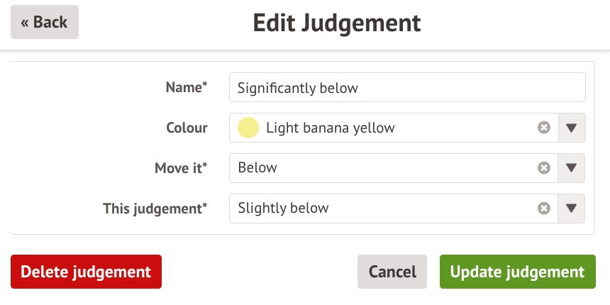 In the target judgments page, you can click into each judgement to see what colour it uses. In my example, significantly below is light banana yellow, hence the 4 in the marksheet being yellow.