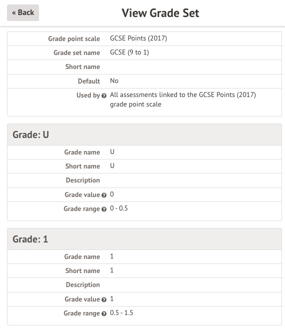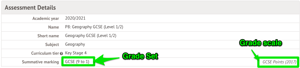 If you don't know which grade set the assessment is using, head to Students > Assessments > Annual Policy > Manage Assessments. Click into the assessment you want to check the grade set for. There check the Summative Marking in the Assessment Details section. You'll see the grade set and the grade scale it's in.