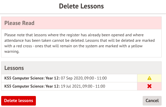 Please note that you will only be able to delete lessons that have not had attendance recorded. Any lessons with a yellow notice icon will not be deleted.