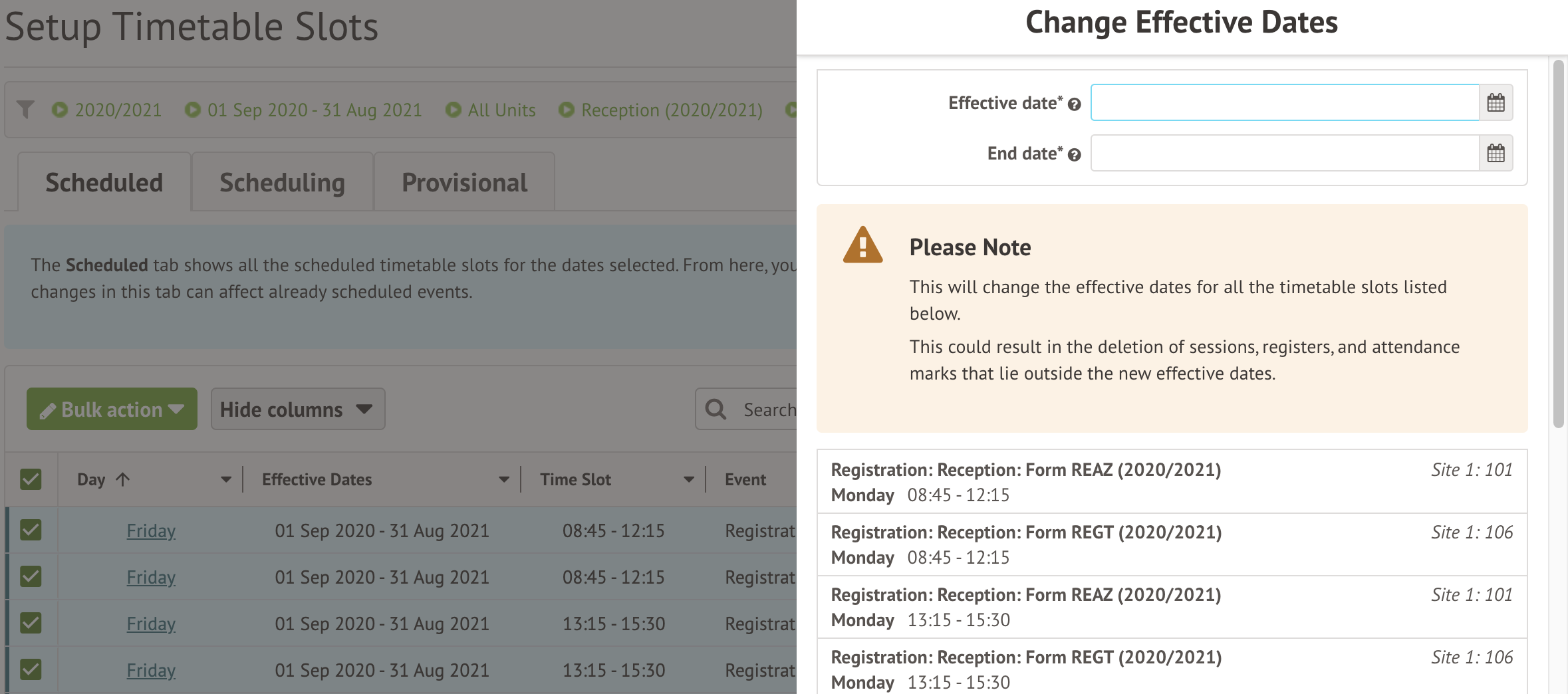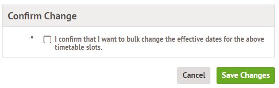 On the left of the page tick all of the slots that you need to change the start date for and use the Bulk action button to Edit Effective Dates.