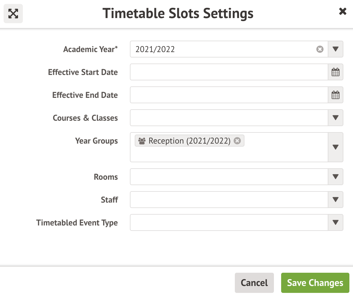 If it doesn't, click into the filter and change the Academic Year and choose the Courses & Classes that you need to change the start date for. In the below example I've chosen the Reception course.