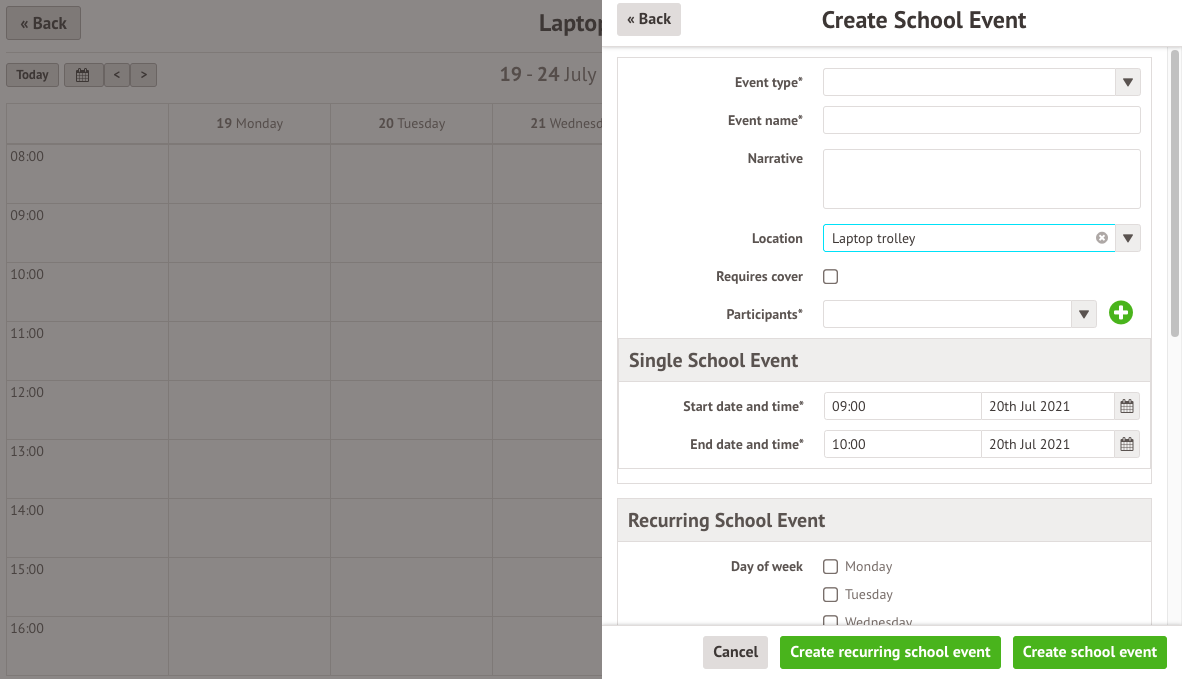 Click on the timetable slot to create an event and book. You can see more information on how to do this in our article on events: Creating and managing events