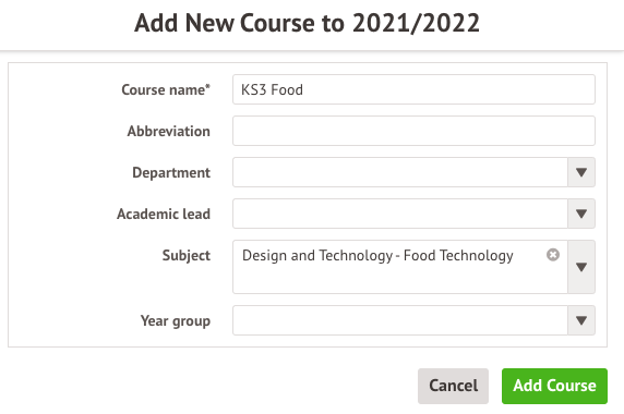 You can only select one year group per course you create. Leave the Year group field blank to be able to create sub-modules assigned to different year groups. When all the details are correct, click on the green Add Course button.