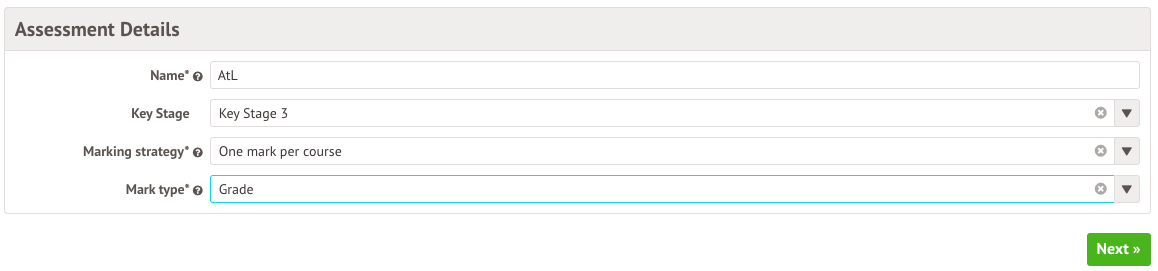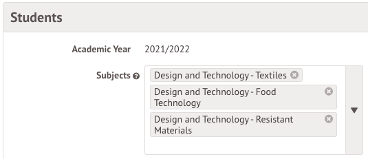 - Subjects - If you only want to assess the Design and Technology courses, select Design and Technology as the subject. If you want to assess all courses, leave this field blank and the assessment will be linked to all the courses.