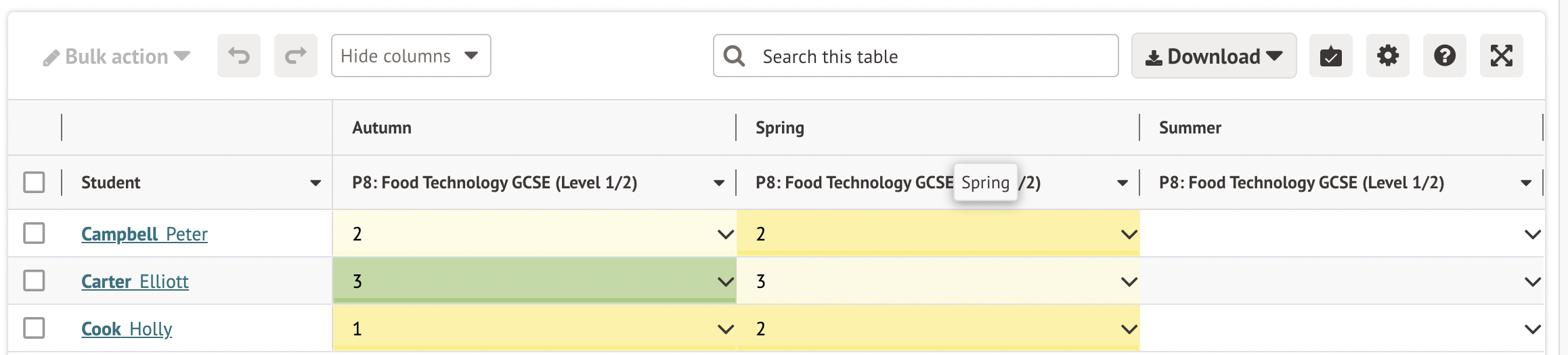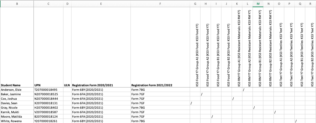 Using the method below will mean students don't appear in marksheets when they're not doing the subject. If you want students to appear in all marksheets all year round contact us for your support or training options.