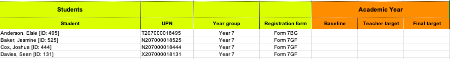 You can fill in the baseline, year target and final target for each student (what they are expected to get at the end of Year 9). Then follow the instructions in the article above to import the baselines and targets back into Arbor.