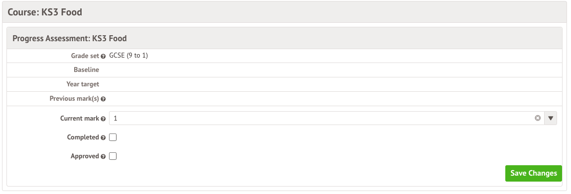 You can update the current mark (this also updates the mark in the assessment's main marksheet), and mark the entry as complete.