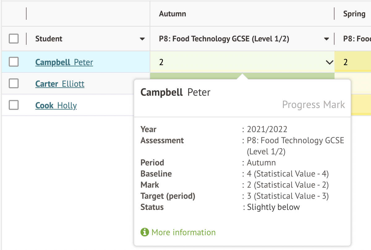 To be able to analyse your overall assessment, you will have needed to input a baseline (to calculate progress) and an Academic Year Teacher Target to get the marksheet to be colour-coded.