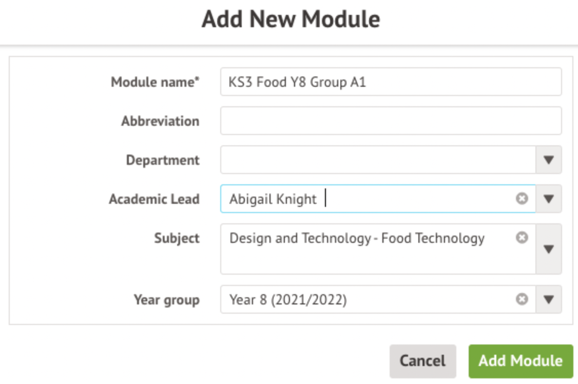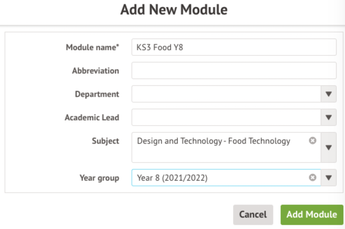 In the slide over add the name of the module and fill in the other details. Select the year group then click the green Add Module button.