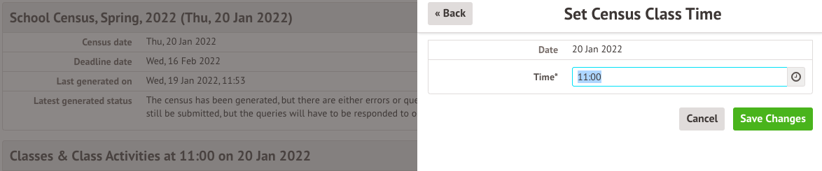 You can see and amend the time of your census by going to School > Data > Export > Data Returns and selecting your Spring Census. Go to Classes from the left-hand menu.