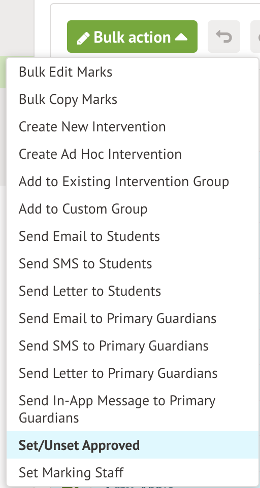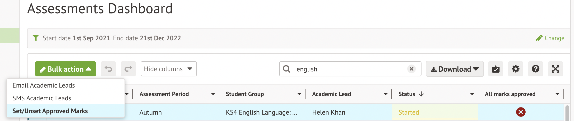 Tick the boxes next to the assessments you want to select, then click the Bulk Action button to choose Set/Unset Approved Marks.