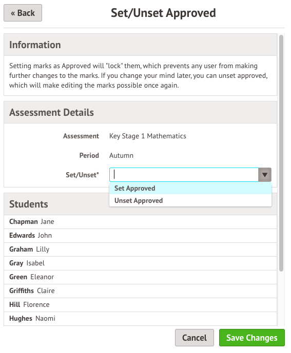 Select Unset Approved to unlock the marksheet for the selected students if more data needs to be input.