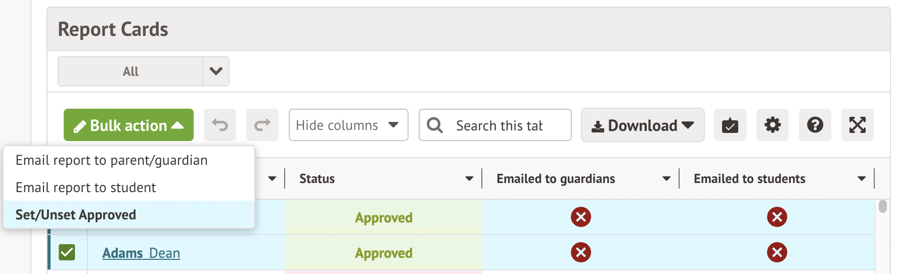 Go to Students > Report Cards and select the report card. Go to the Report Cards tab, select the students, then click the Bulk Action button to Set/unset approved.