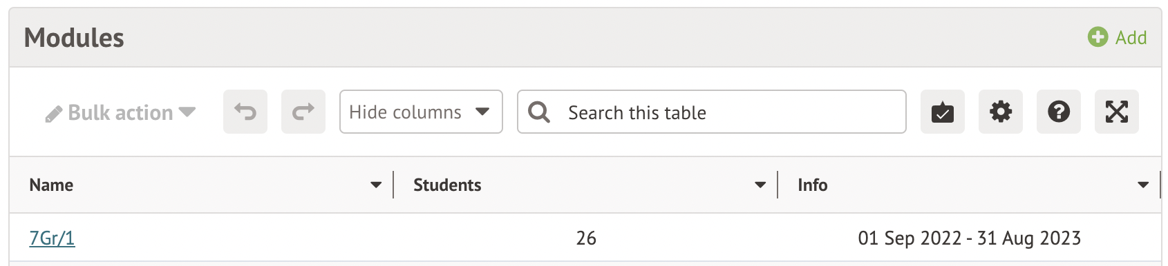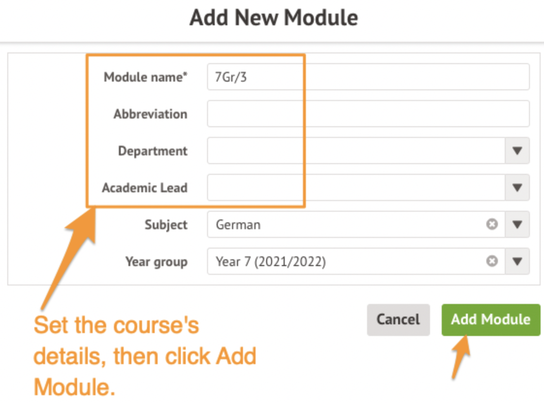 - On the Add New Module slide over, set your the class name as the Module Name - other details such as the Subject and Year Group should be set automatically. Click Add Module to create the new course.