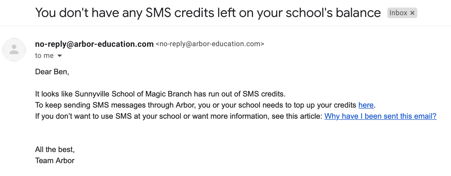 Arbor will send users with the School: Communication: Setup permission an email when your school is running low on SMS credits.