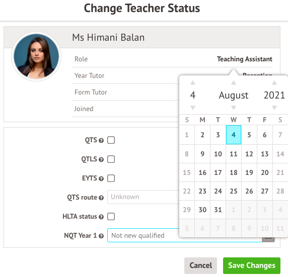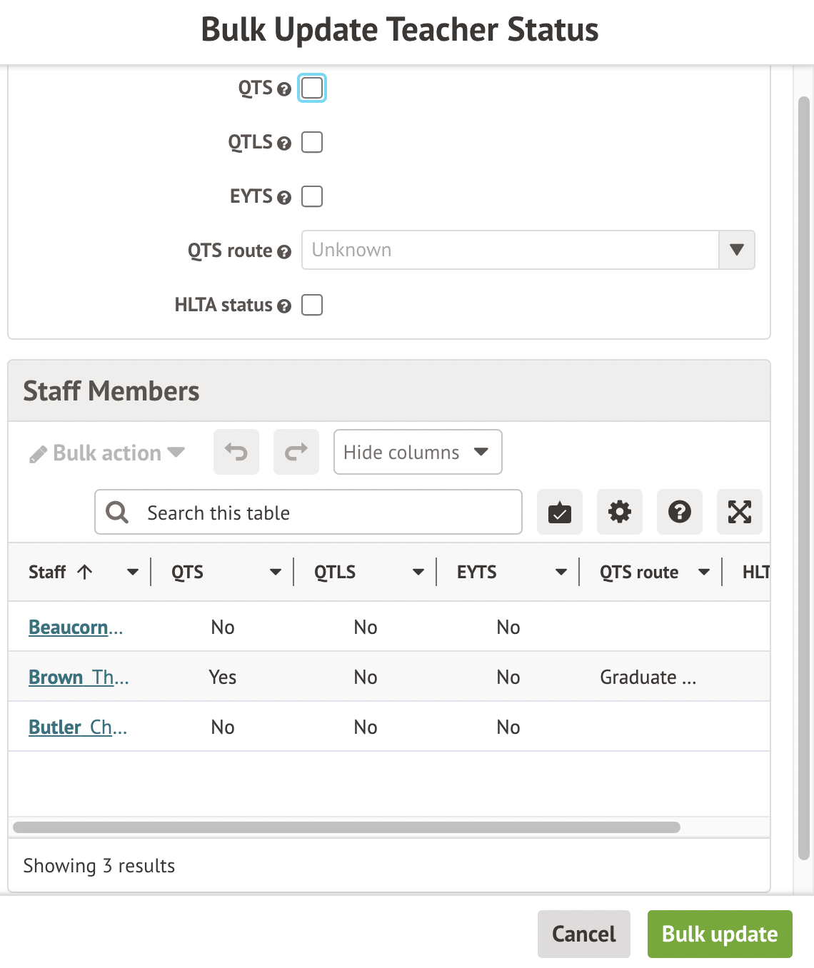 In the slide over, select whether they have QTS, QTLS and EYTS. If they have QTS, select the QTS route. You can also tick if they have HLTA status.