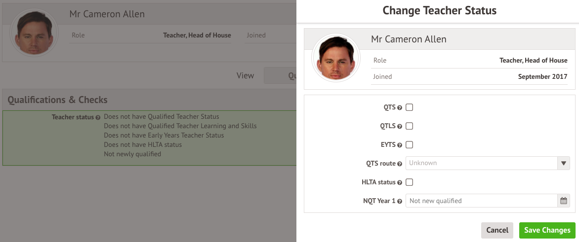 Go to the staff member's staff profile and click into Teacher status in the Qualifications & Checks section. Add the information into the slide over.