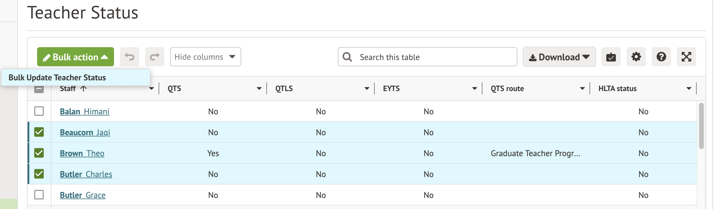 For any staff at your school who are teachers, you'll need to record some information on their teacher status, to be collected in the Workforce Census. You can check and update this information in bulk, and from the staff member's staff profile.