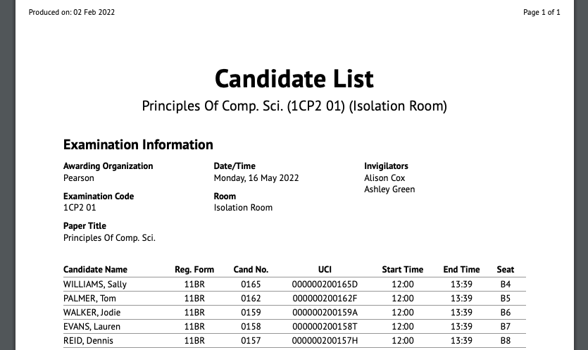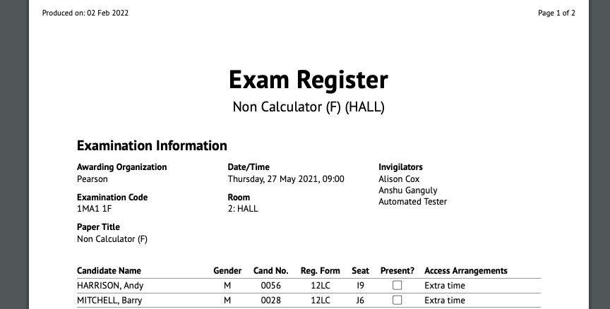 You can print examination registers and candidate lists in Arbor - useful for exam invigilators to tick off who is present in the exam.