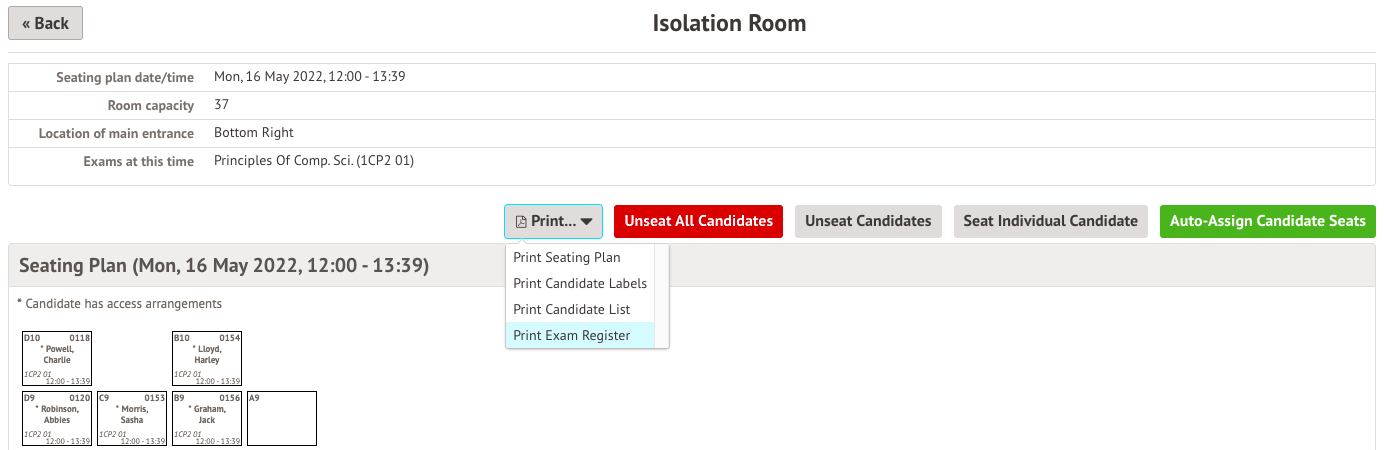 To print a register for an individual sitting or exam, click into the sitting or exam. Click the Print button, and select the applicable option.