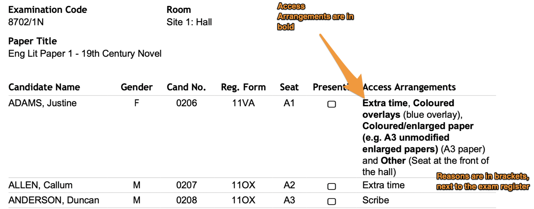 If your school has chosen to display Access Arrangement reasons in the exam register, you'll be able to see these in brackets next to the Access Arrangement. You can see how to switch this on here.