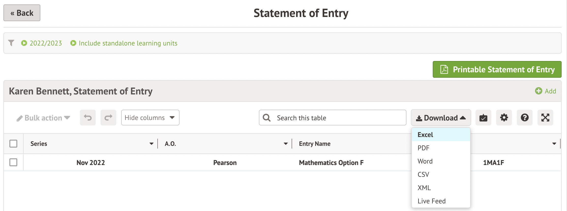 Go to the student profile and click Examinations from the left-hand menu. Select Statement of Entry.