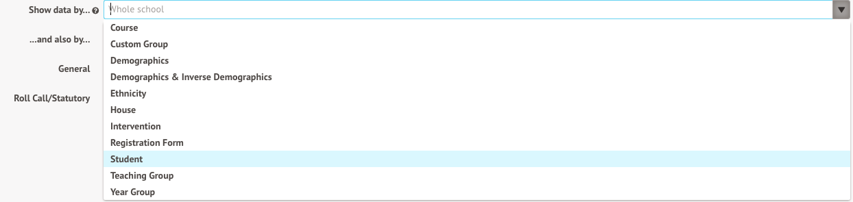 When searching for the attendance for your class, you will have the ability to manage how the attendance data is displayed. This can be displayed through specific field contents such as per student, house, registration form etc.