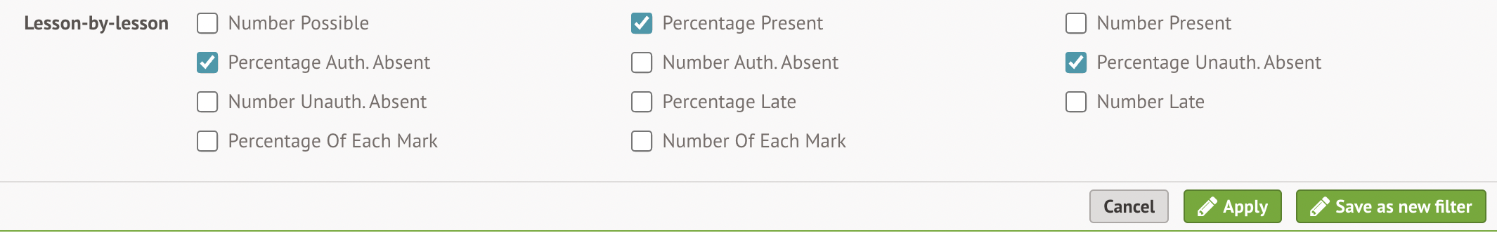 To view attendance for each class, choose to show data by Course, and tick the boxes shown below - you must select Lesson Attendance.