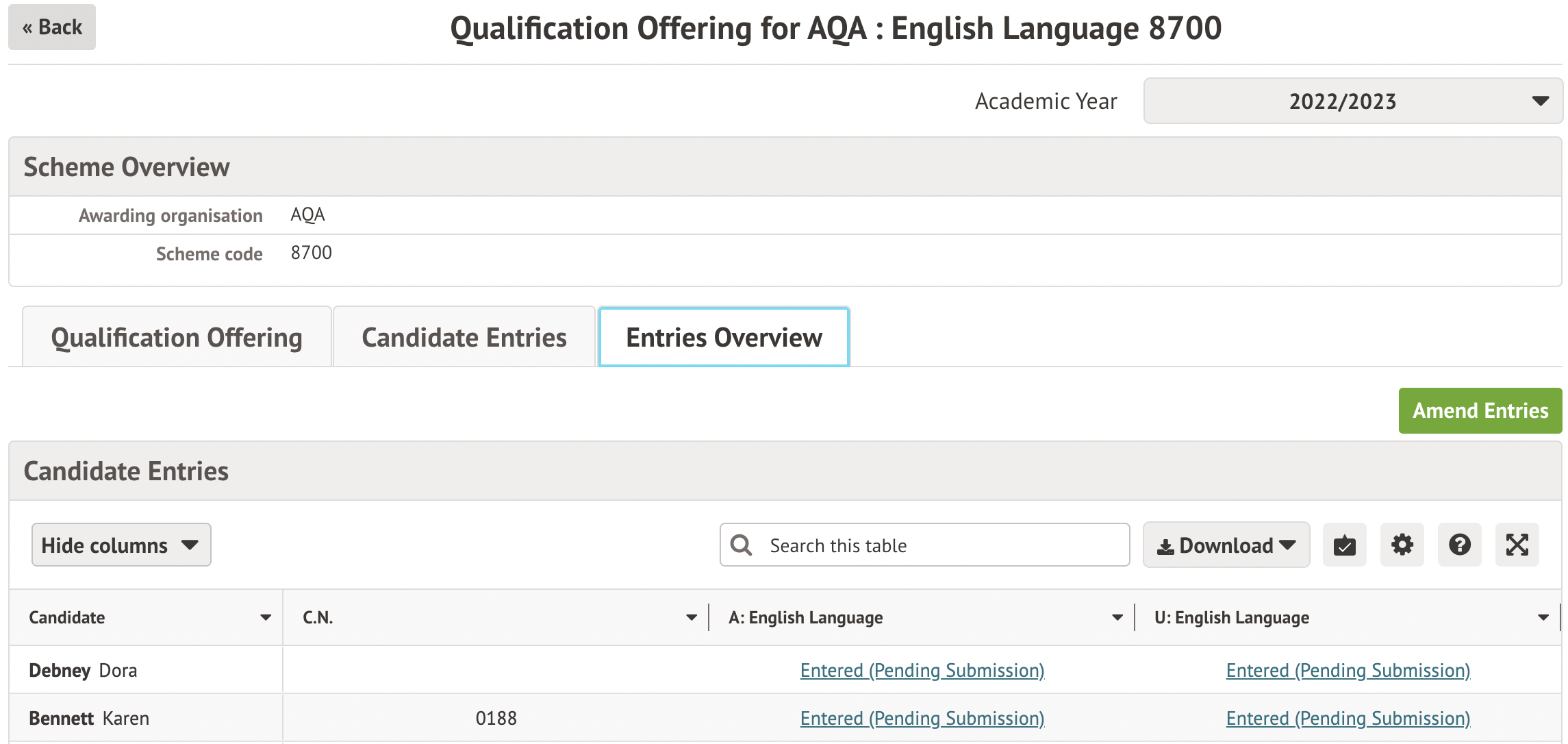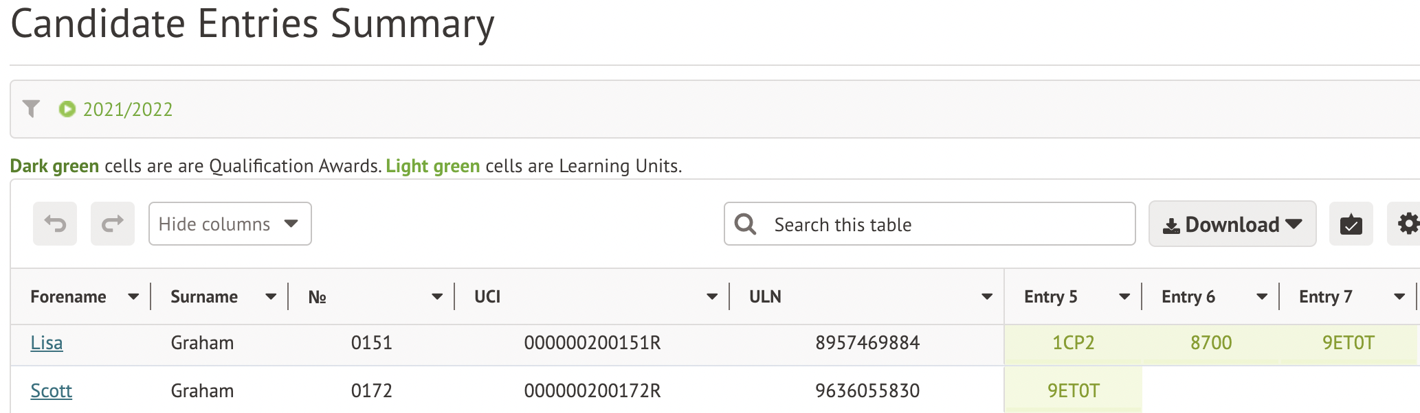 - Use by subject for candidate names, numbers and entries for the award and unit codes.