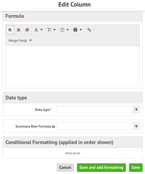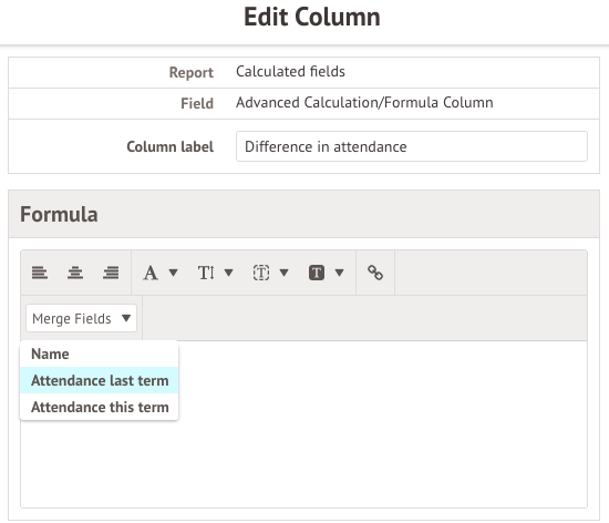 When adding calculated fields, type into the box, and click Merge Fields to select a report column to include in your calculation.