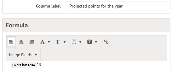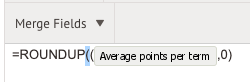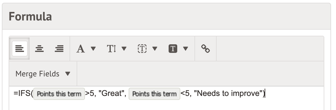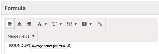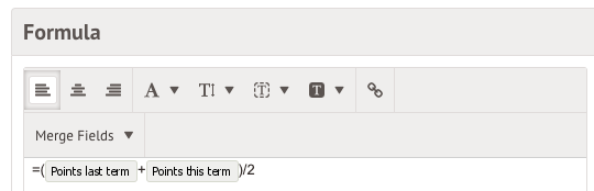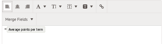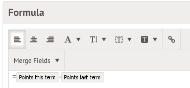 - Wrap any merge fields that output text in quotation marks (put " before and after the field). Number fields do not need the quotation marks, shown below with Points this term.