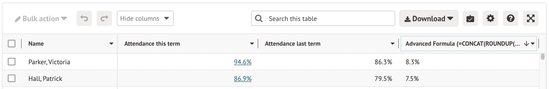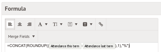 Here I have worked out the difference in attendance to one decimal place, and have concatenated it with the % symbol.