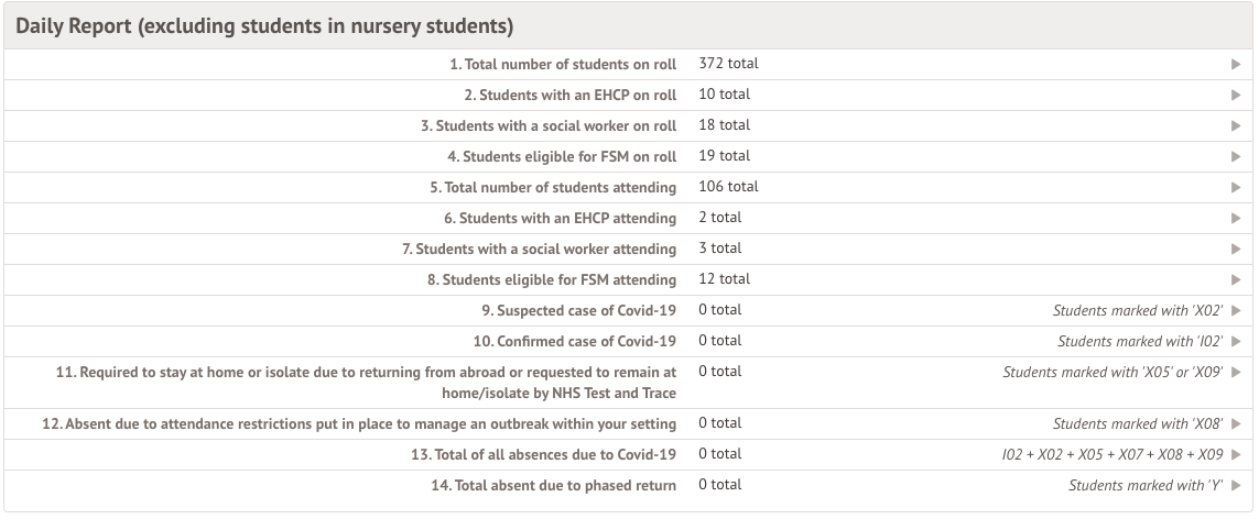 You'll see rows on your Covid-19 Dashboard for each category of covid-19 related absences that were collected by the DfE. Please note that nursery students are not included in the overview totals for each field on the Dashboard.