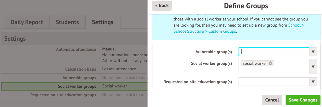You can use a custom group for students who have Social Worker to enable us to pull through the right numbers to your Covid-19 Dashboard. You can use custom groups for Students who have requested on-site education that have a key worker guardian, and Vulnerable students, but they are not reported on your Covid-19 Dashboard.