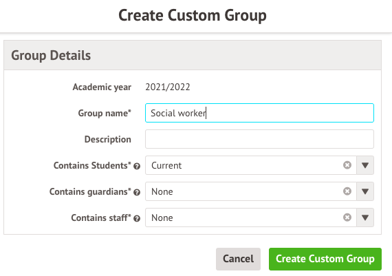 To create them from scratch, go to School > School Structure > Custom Groups and click to add a new custom group.