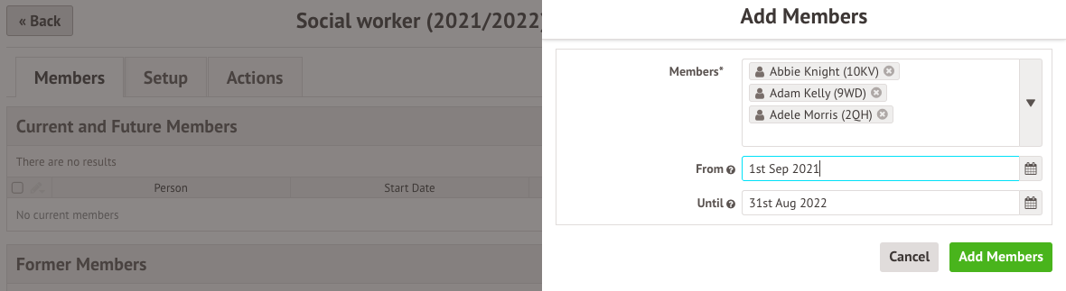 Choose the students to enrol in this group, and the date range they will be enrolled in this group for, then click Add Members.