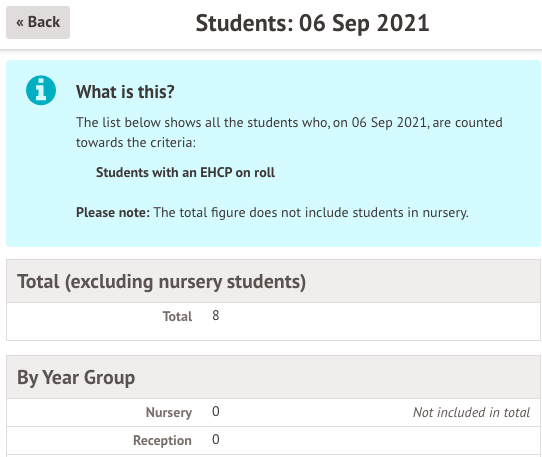 When you click on a field you can also view a breakdown for each year group and a full list of students that contribute to the numbers. In line with the DfE’s guidance, students may appear in more than one group so may be counted twice.