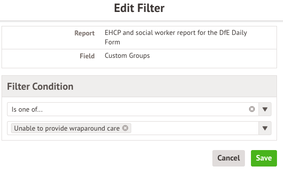 Add a filter for Custom Groups and select your 'unable to provide wraparound care' custom group - please note you will have needed to create the custom group.