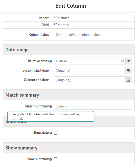 - In the slide over you get next you can add specific filters if needed such as Date Range (referring to the date of the note) and Match Summary (used as the title of the SEN note) to search for notes with a specific title. If no filters are added, all SEN notes will be shown in one cell. You can also choose whether the summary or the date should be shown. Click Save to continue.