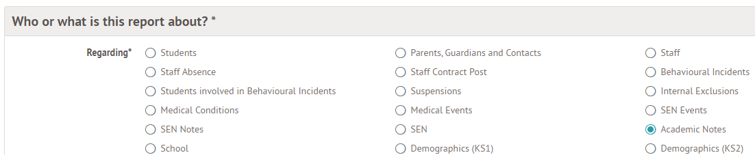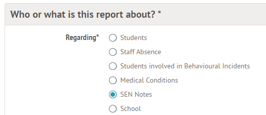 If you need to see a list of academic or SEN notes for your students with SEN, you can do this from the Custom Report Writer through 3 different types of reports depending on what you need. This could be used to create an Individual Education Plan.