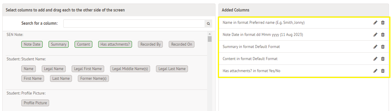 - On the next page use the 'Search for a column' box to find SEN Notes then drag it to the right-hand side.