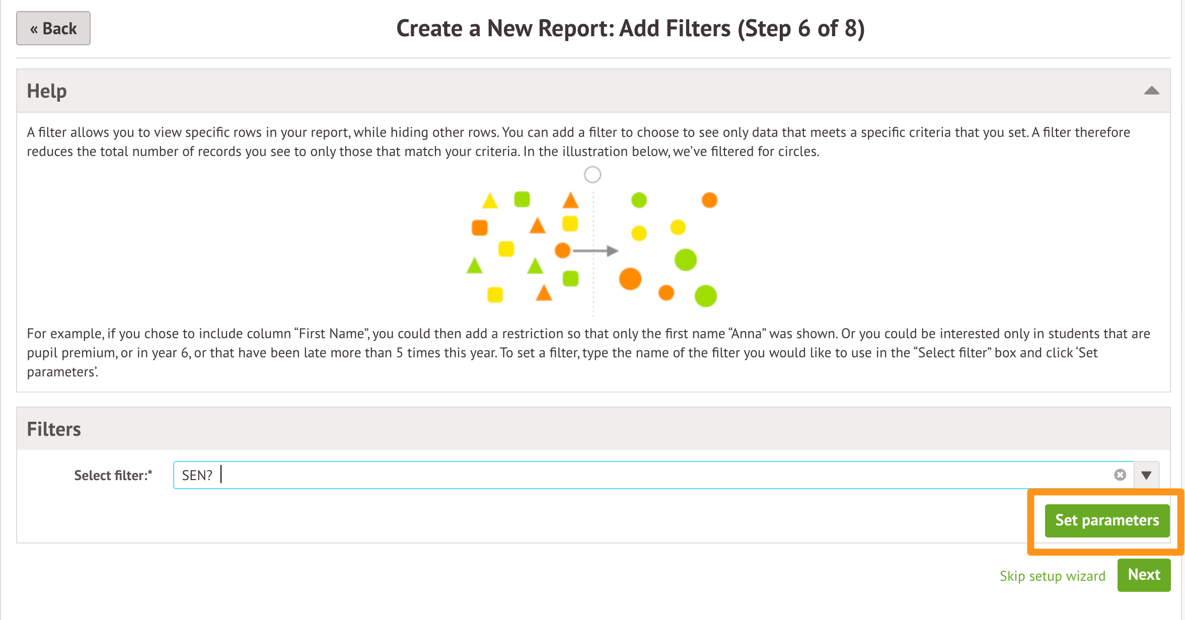 - Click the green button to continue through the next pages until you get to Add Filters.