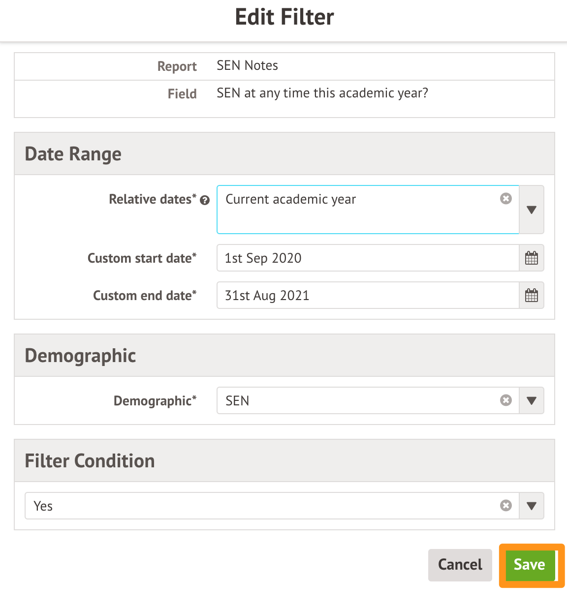 In the slide over, check your date range is correct and the Filter Condition is set to Yes. Click the green Save button.